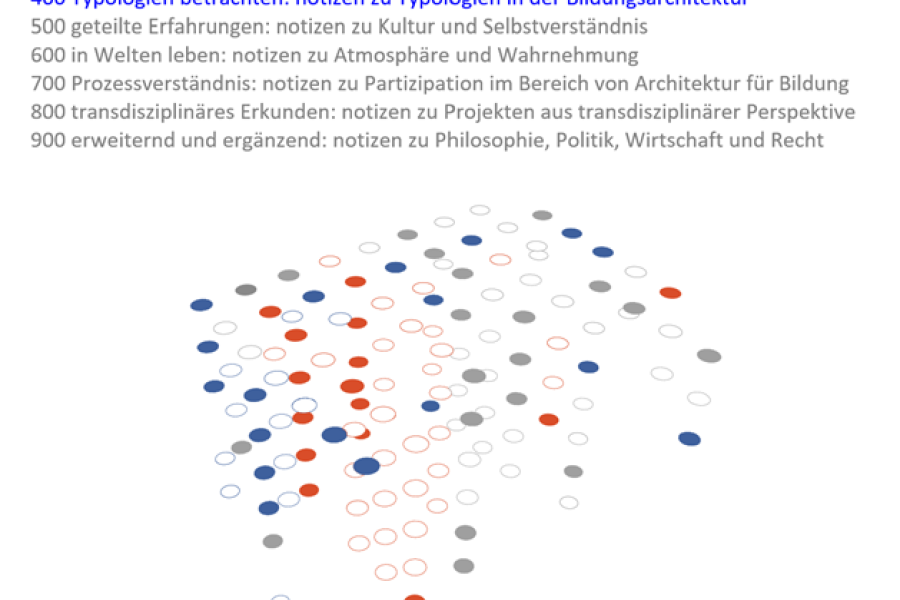 Um dem Wachsen entsprechend Raum zu geben, sind die Beiträge in einem dreidimensionalen Rankgerüst eingelagert, das einen inhaltlich strukturierten Raum für zeitlich unterschiedlich eingehende Beiträge zur Verfügung stellt. Dieser Raum ist auch in Form einer abrufbar und kann derart als ein wachsendes Inhaltsverzeichnis verstanden werden. Inhaltlich sind neun Kapitel von den Ordnungsstellen 100 bis 900 angelegt, die durch ihre drei Farben rotorange, blau und grau für Zuordnungen zu Architektur, Bildung und Allgemeines bzw. Gemeinsames stehen: