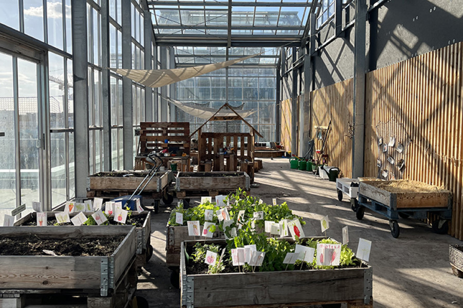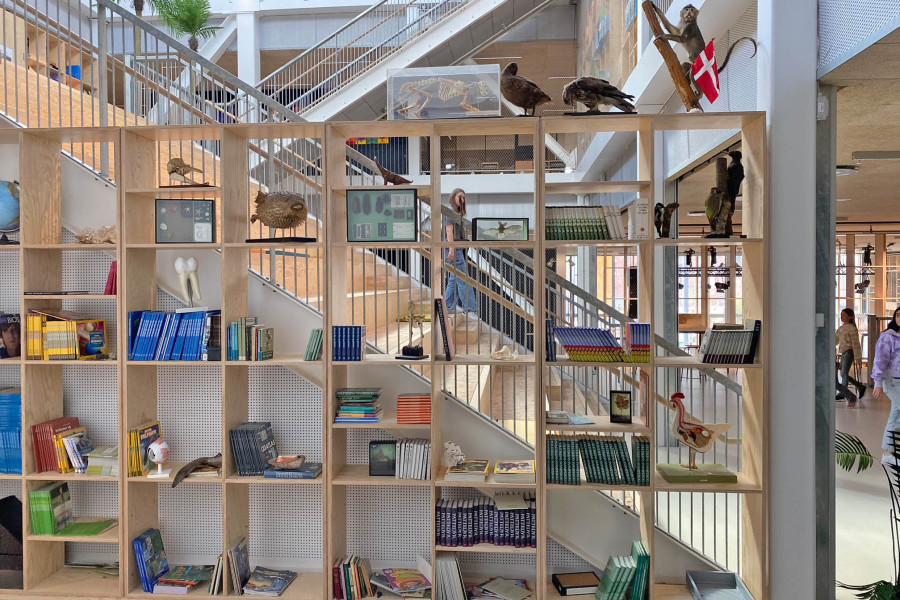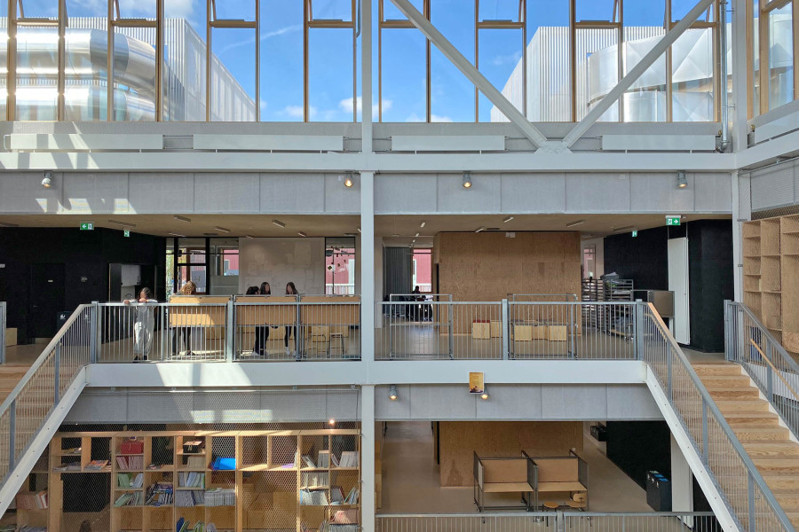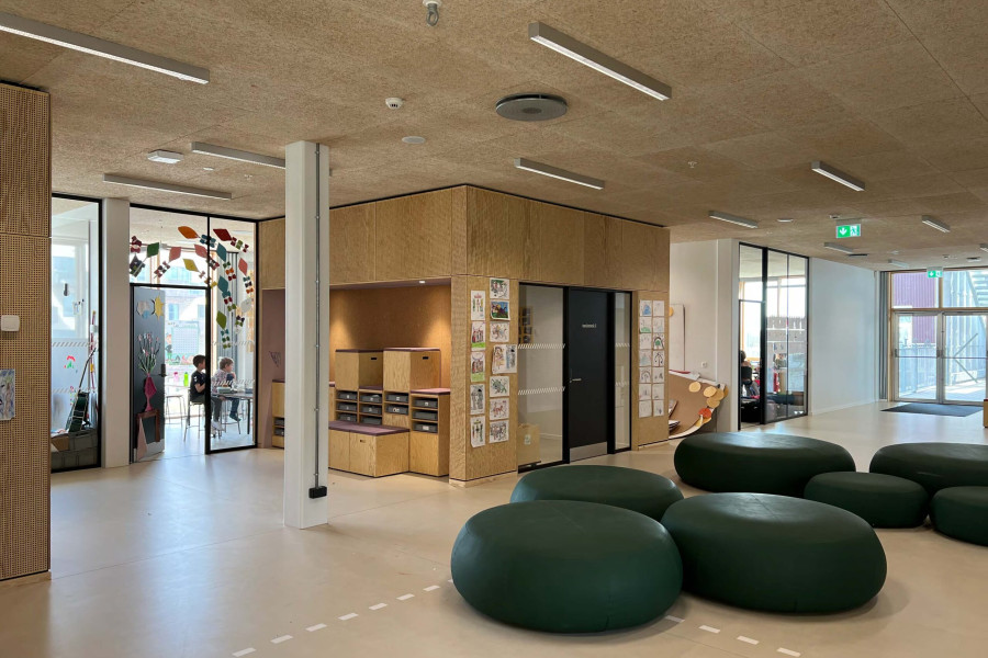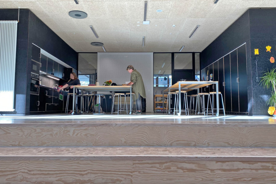 Die Schule zeigt sich als offene Lernwerkstatt mit sehr unterschiedlichen Raumzonen, Lagerbereichen, Schausammlungen und großzügigen Versammlungsorten. Über das gesamte Haus verteilt finden sich Rückzugsnischen, die von den Kindern in unterschiedlichen Konstellationen angenommen werden. Direkt beim Betreten der Schule hat man das Gefühl, quasi bei ihnen „zuhause“ zu sein. Mit weißen Markierungen auf dem Boden werden Raumzonen ausgewiesen, die unterschiedlich möbliert sind und von den pädagogischen Teams über das zentrale Raumsystem gebucht werden können. Für alle zugängliche Teeküchen, Garderoben vor den Terrassenausgängen, Werkstätten, Labore und Musikübungszellen ergänzen das räumlich offene Angebot. Ein interessantes Detail sind die vielen Schwerlast-Deckenhaken, in welche weitere Abtrennungen, Ausstellungsstücke oder auch technische Geräte eingehängt werden können und die somit den offenen Raum als weitere Displayfläche erschließen.