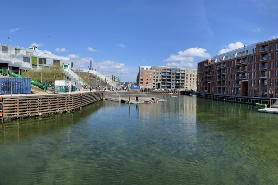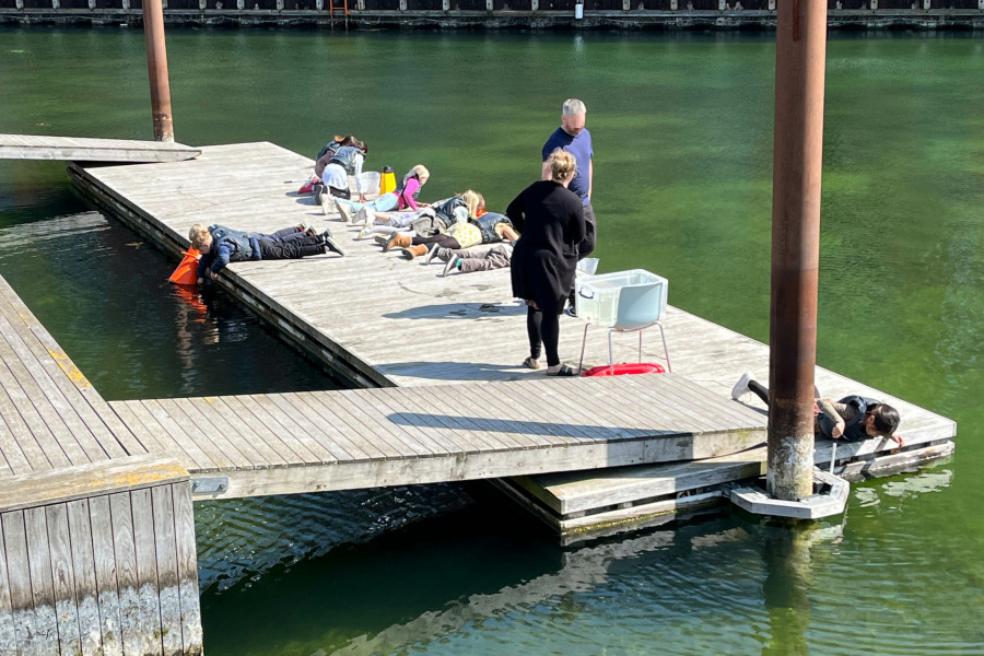 Die Skolen i Syhavnen von JJW Arkitekter zeigt sich als große Freitreppe innerhalb eines neu entwickelten Stadtgebietes und wird somit selbst zu einem öffentlichen Stadtraum. Die Treppe selbst wird auch als Lernort eingebunden. Während am Fuß der Treppe auf einem schwimmenden Plateau einige Kinder kleine Tiere aus dem Wasser fischen, wird die Treppe im oberen Bereich als Sportparcours genutzt. Interessant ist der Umgang mit der freien Wasserkante. In Kopenhagen ist die Hafenkante ohne Absicherung ein selbstverständlicher Bestandteil des öffentlichen Raumes – der in diesem Fall von der Schule mitgenutzt wird. Lediglich ein 15 cm hoher Holzbalken ist an die Kante gelegt. In dem blauen Container sind Fahrgeräte für die ganz Kleinen gelagert, welche die Hafenkante in Pausenzeiten in eine beliebte Rennstrecke verwandeln.