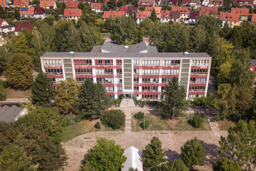 Die vierzügige Schule ist in einem Bestandsgebäude aus den 1950er-Jahren untergebracht. Die kammerartige Gebäudestruktur wurde 2016 durch einen Neubau [1] für die Sekundarstufe I erweitert. Er bietet allgemeine Unterrichtsräume für vier Jahrgänge, Fachräume für Naturwissenschaften, Technik, Kunst und Musik, Verwaltungsräume sowie einen multifunktionalen dreigeschossigen Veranstaltungs- und Versammlungsbereich, der mit der großzügigen Sitzstufenanlage das Atrium, das „Herz“ der Schule, bildet. Das pädagogische Konzept der Neuen Schule basiert u.a. auf fächer- und jahrgangsübergreifendem Unterricht. Der sehr kompakte Neubau der Sekundarstufe I fördert durch die unmittelbare Nähe und Offenheit der einzelnen Funktionsbereiche die Interaktion, ermöglicht Synergien und schafft somit Mehrwerte. Im Obergeschoss gliedern sich vier transparente Jahrgangscluster um die gemeinsame Mitte und beherbergen neben den jeweils vier Unterrichtsräumen Flächen für individuelles Lerne, Gruppenbereiche, einen Teamraum und eine den Unterrichtsräumen zugeordnete Terrasse.