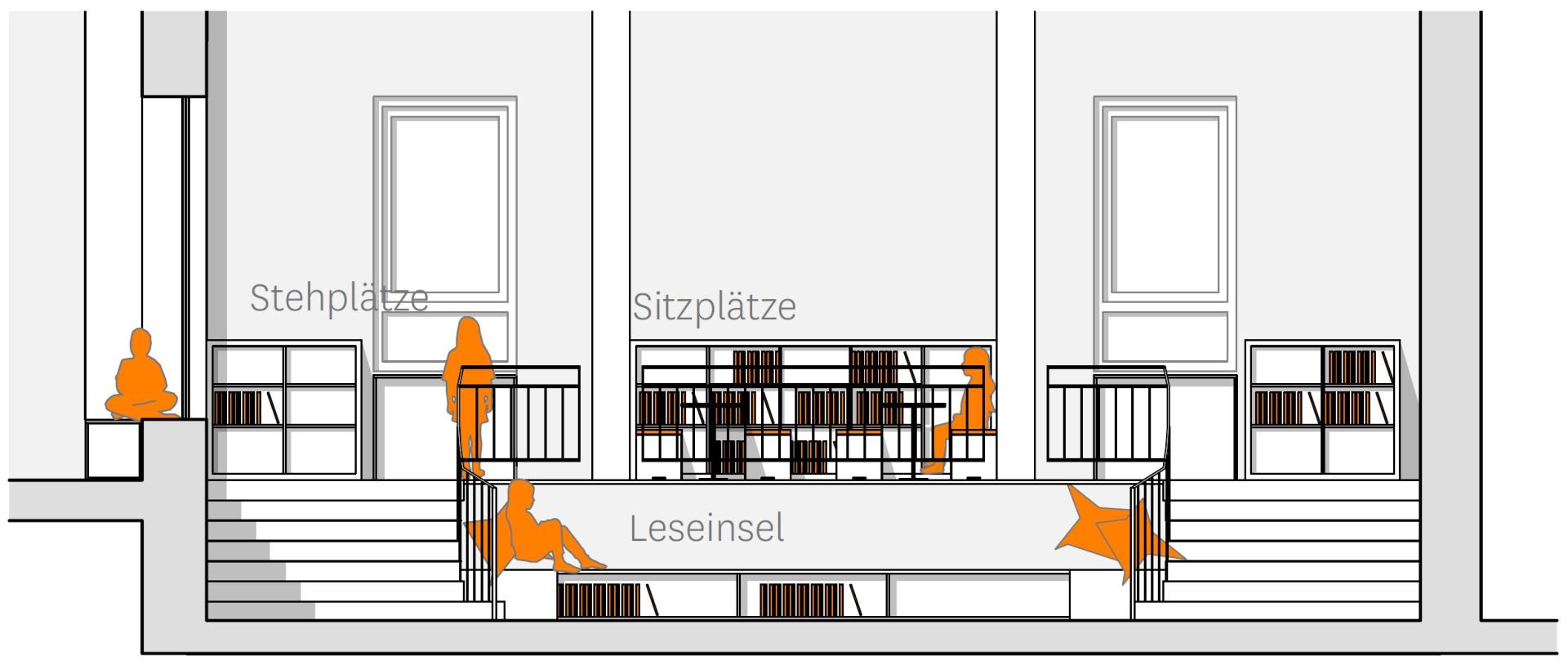 Grundlage der veränderten Raumnutzung bilden die Neustrukturierung der Flächen des denkmalgeschützten Gebäudes sowie ein Zugewinn an pädagogisch nutzbarer und frei möblierbarer Fläche durch ein verändertes Brandschutzkonzept (siehe Schwerpunkt der kommenden Veranstaltung „Veränderte Brandschutzkonzepte in Bestandsgebäuden“). Geringe Umbaumaßnahmen und Eingriffe in den Bestand schaffen Sichtbezüge, die Glaselemente dienen zudem als Sitznischen.
