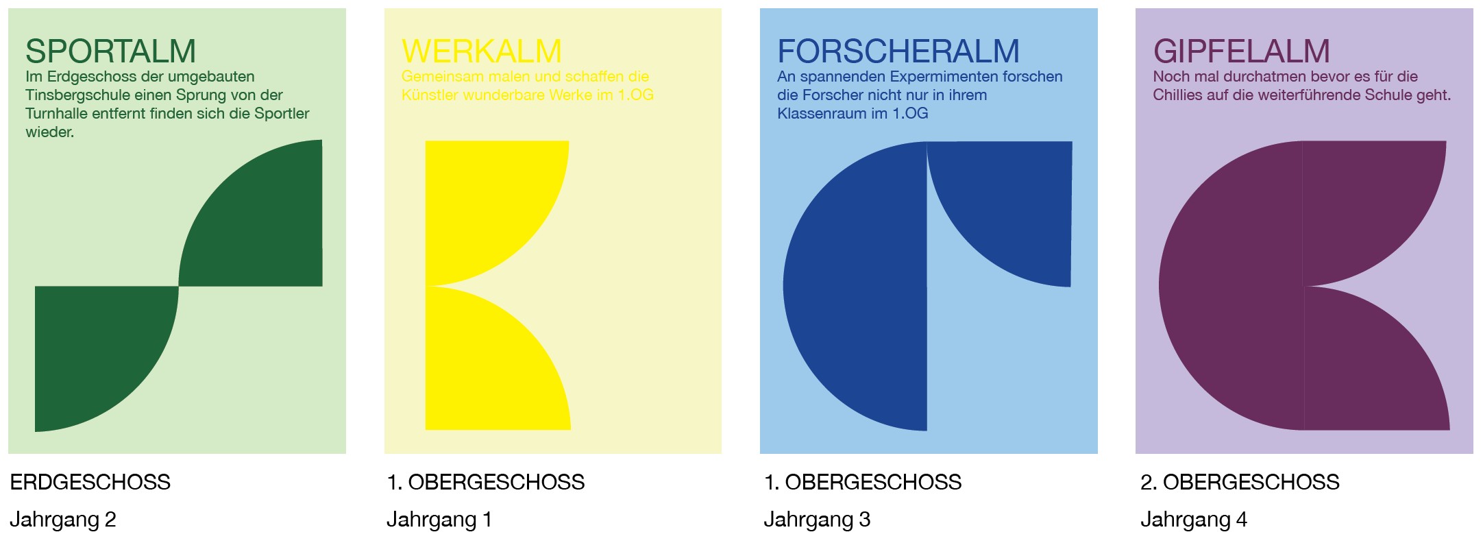 Die Jahrgangscluster bilden die Bedarfe über den ganzen Tag ab mit Elementen für Einzelarbeit, Gruppenarbeit, Input, Bewegung und Rückzug. Neben den Grundelementen gibt es in jedem Jahrganscluster besondere Themenbereiche mit entsprechender Ausstattung (Forschen, Kunst, Bewegung, Musik ...), die der gesamten Schulgemeinschaft zur Verfügung stehen.