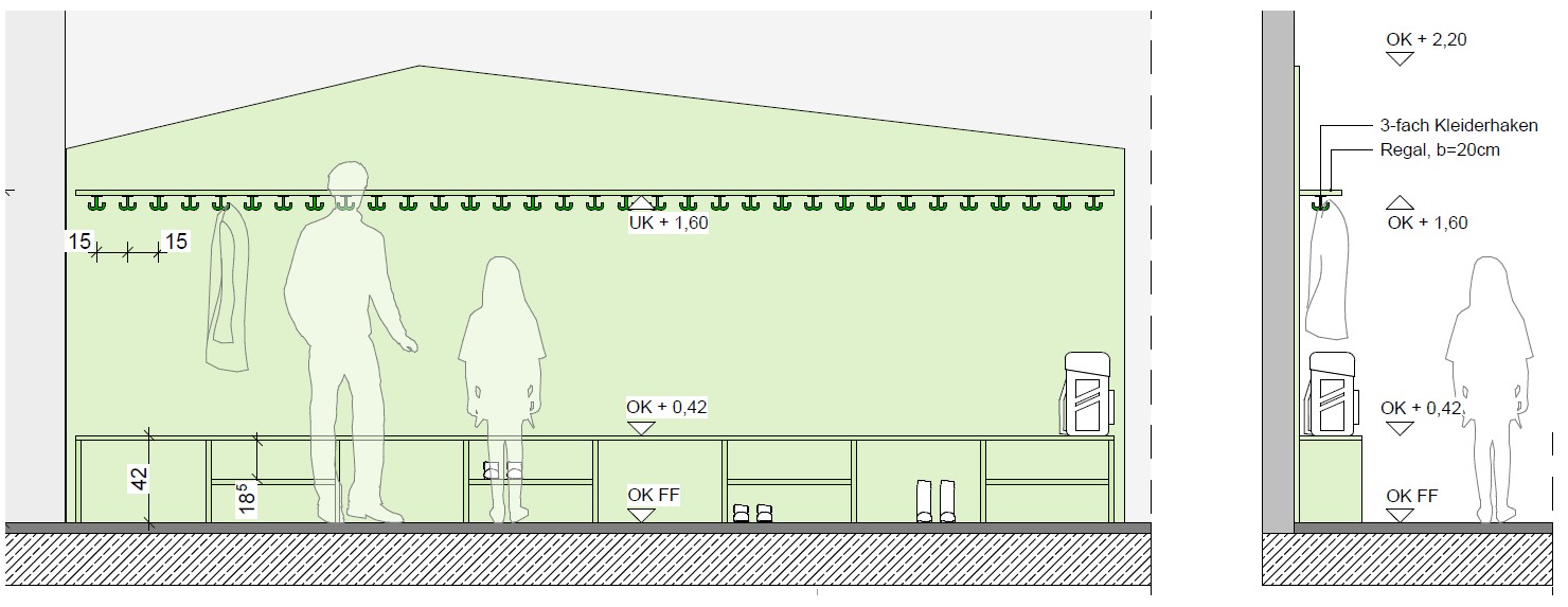 Die Garderoben entlang der Wege sind hinsichtlich der Abläufe, Dimensionen und Einteilung gut organisiert, bieten Ablageort für Ranzen, Schuhe und Jacken und halten somit die Lernbereiche frei.