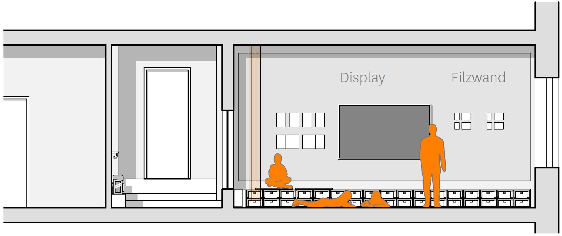 Der Inputbereich bildet Heimat und Treffpunkt einer Lerngruppe, ist durch einen Teppich zoniert und lässt sich durch einen Vorhang visuell abgrenzen. Die Bank unter dem Display bietet zudem Stauraum.