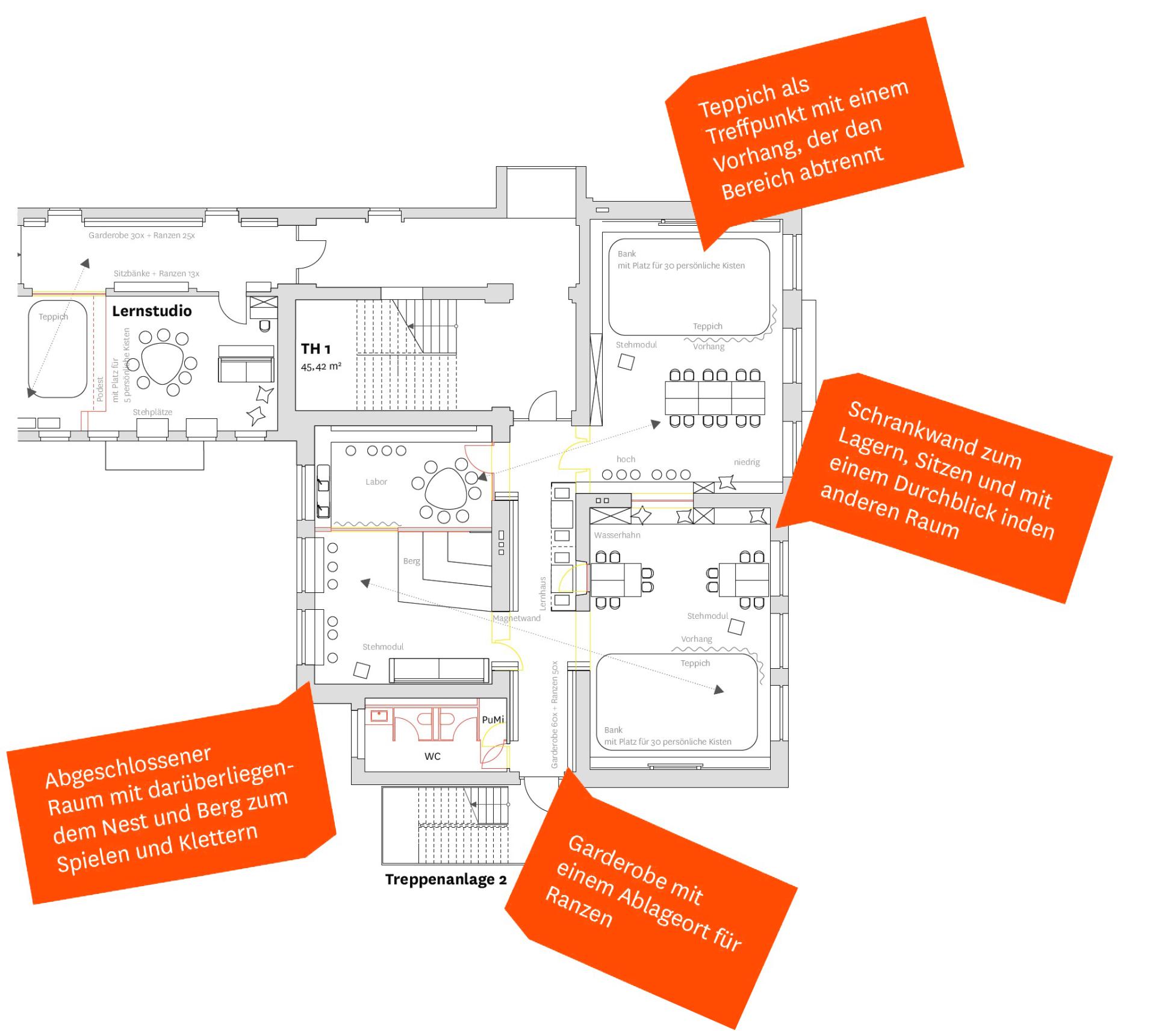 Die Jahrgangsbereiche sind nicht mehr klassisch möbliert, nicht jedes Kind hat einen eigenen Tisch und Stuhl (in Anlehnung an das „Churer Modell“). Die veränderte Möblierung ermöglicht verschiedene Aktivitäten und bildet vielfältige Lernsettings und Rückzugsmöglichkeiten: