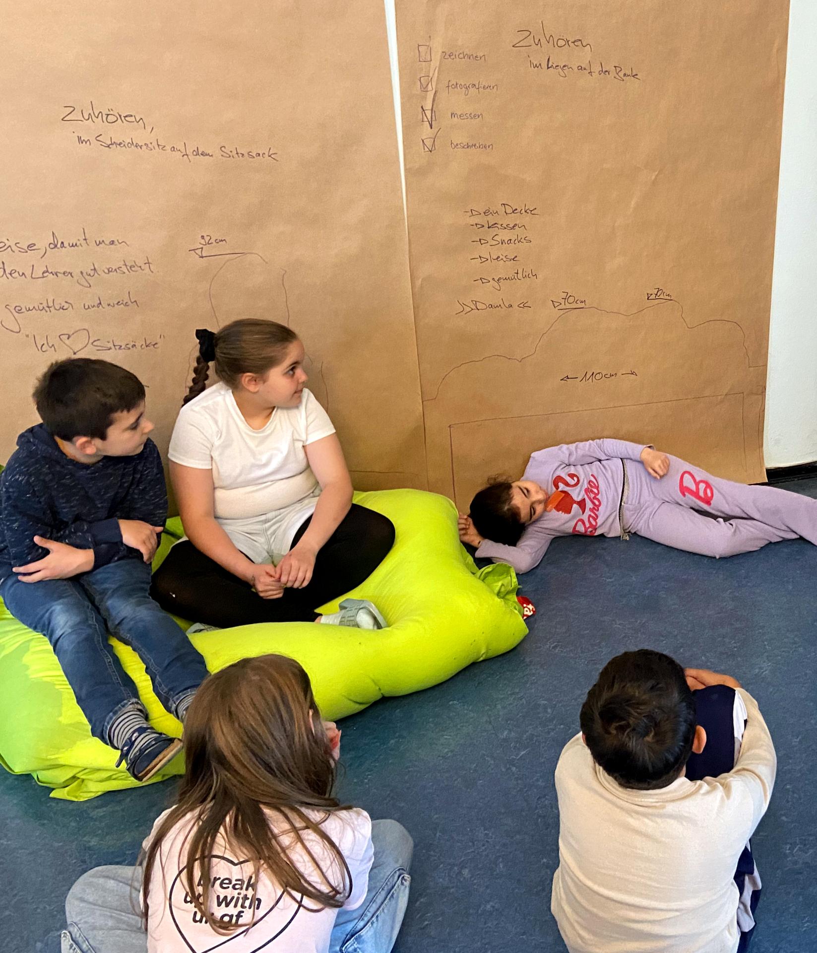Als Hauptnutzer*innen und Expert*innen vor Ort werden die Kinder im Prozess beteiligt und reflektieren die verschiedenen Orte. Im Workshop erforschen sie, was sie für verschiedene Aktivitäten wie entspannen, lesen, zuhören benötigen und in welcher Position dies am besten gelingt. Mit dem Ergebnis: nur selten braucht es Stuhl und Tisch!