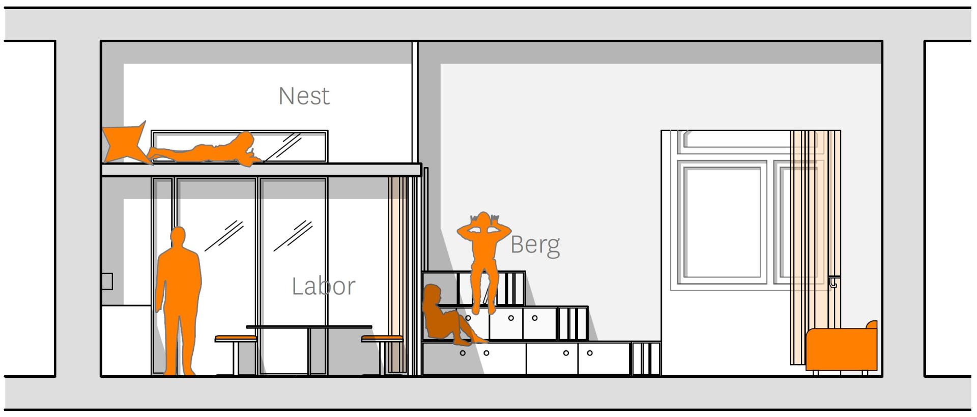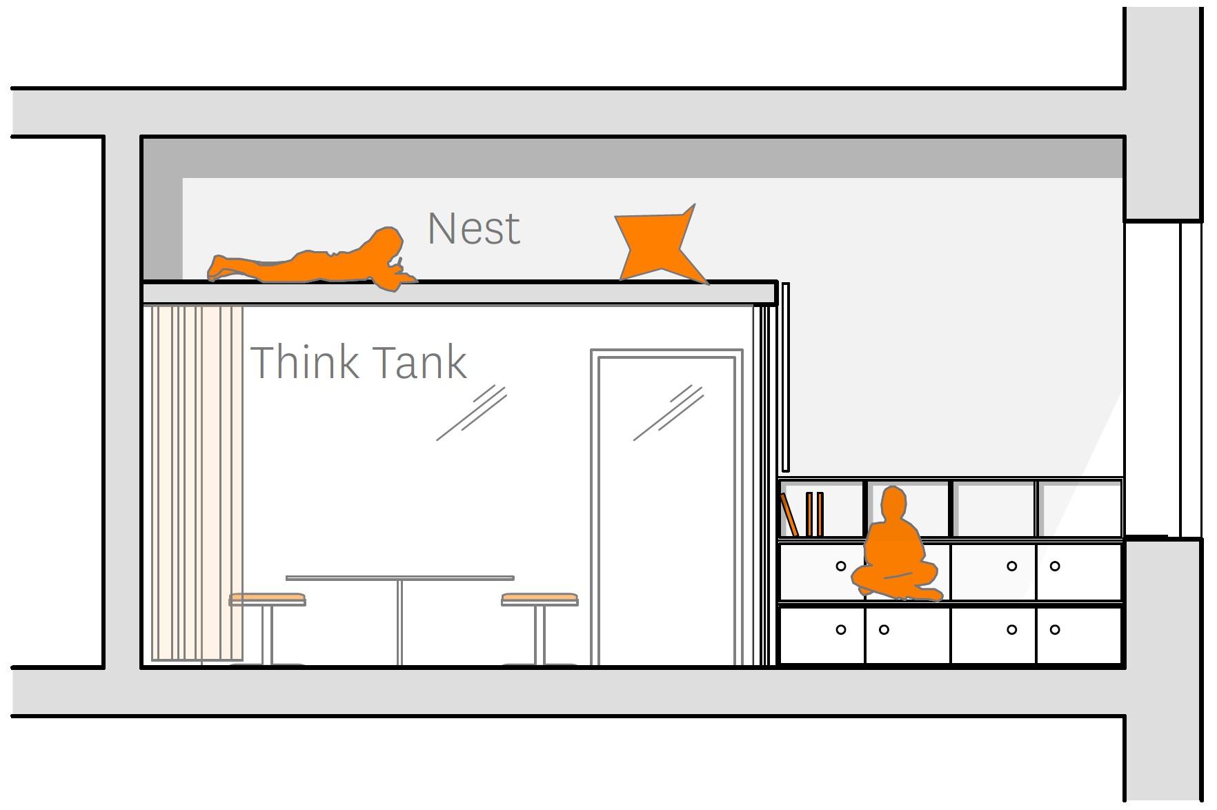 Leise Orte für Ruhe und Entspannung, ruhiges Lesen und Lernen, konzentrierte Gruppen- oder Partnerarbeit, aber auch für Rückzug und Versteck oder Gespräche finden sich in abgetrennten Raumboxen (Think Tanks), der Sitztreppe und dem darüberliegenden „Nest“. Im Altbau wurde hierzu die hohe Raumhöhe für Raum-in-Raum-Orte und eine zweite Ebene genutzt. Alternativ wurde ein modulares Möbel entwickelt, mit dem sich Raumbereiche abtrennen lassen.