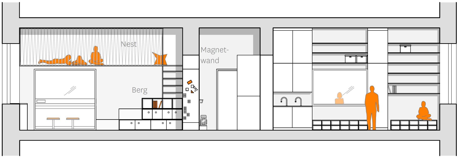 Lagermöglichkeiten sind verteilt im Cluster für gemeinsam genutzte Materialien, aber auch persönliche Kisten als Eigentumsfächer für die individuellen Lern- und Arbeitsmaterialien, sowohl für die Kinder als auch das multiprofessionelle Team. Entlang mancher Innenwände befinden sich Schrankwände zum Lagern und Sitzen mit Durchblicken zum benachbarten Raum und gepolsterte Sitznischen.