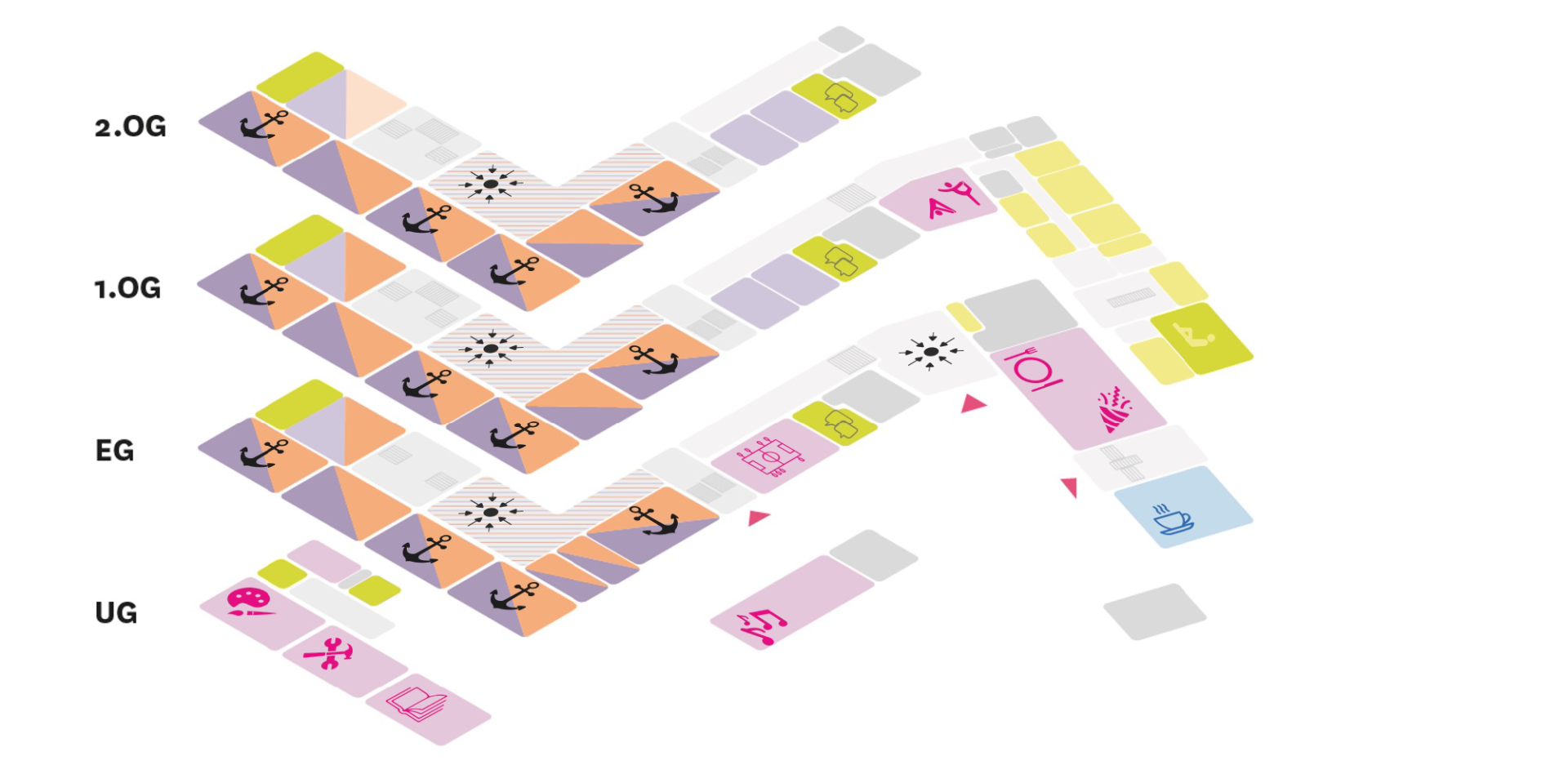 Aus der ehemaligen Klassenraum-Flur-Schule der 1950er-Jahre mit separatem Hortgebäude entsteht so das Konzept des „Bremer Heimathafens“. Durch das integrierte Nutzungskonzept gelingt es, die bestehenden räumlichen Strukturen zukunftsweisend zu verändern: Feste Klassen- und monofunktionale Fachraumstrukturen werden aufgelöst und durch aktivitätsorientierte Bereiche ersetzt – für konzentrierte Einzelarbeit, Gruppenarbeit, Inputphasen, Begegnung, Rückzug oder Bewegung. Jeweils zwei benachbarte Lerngruppen mit eigenen Ankerräumen teilen sich eine kommunikative „Wohnküche“ und eine „Arena“ für Input und Präsentation. Zusammen mit zwei weiteren Lerngruppen bilden sie einen Heimathafen pro Geschoss, dem darüber hinaus ein Ruhebereich, ein Teamraum und die gemeinsame Mitte zugeordnet sind. Über das Gebäude verteilt gibt es zudem buchbare Büros, kleinere Gruppenräume und verschiedene Bewegungs-, Werkstatträume sowie eine Bibliothek im Souterrain. Die Verwaltung zieht in das ehemalige Hortgebäude, in dessen Erdgeschoss sich die Küche mit angrenzendem multifunktionalem Bistro- und Cafébereich befindet.