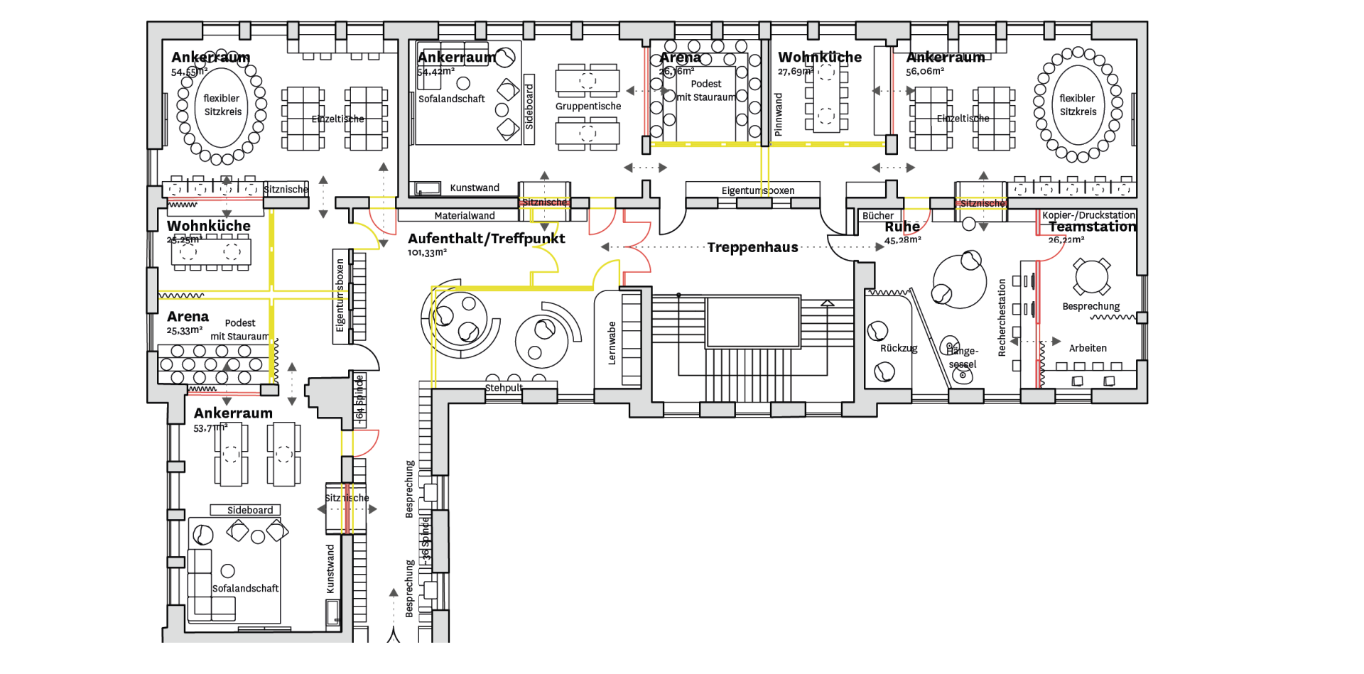 Der Grundriss wird hierzu unabhängig von der bisherigen Raumaufteilung hinsichtlich der Optionen im Bestand analysiert. Die Räume werden Aktivitäten und nicht ausschließlich Klassen und Fächern zugeordnet. So können Flächen effizienter über den ganzen Tag hinweg gemeinsam genutzt werden. Bislang nicht-pädagogisch genutzte Bereiche, insbesondere Erschließungsflächen, können durch ein angepasstes Brandschutzkonzept in die pädagogischen Flächen integriert werden.