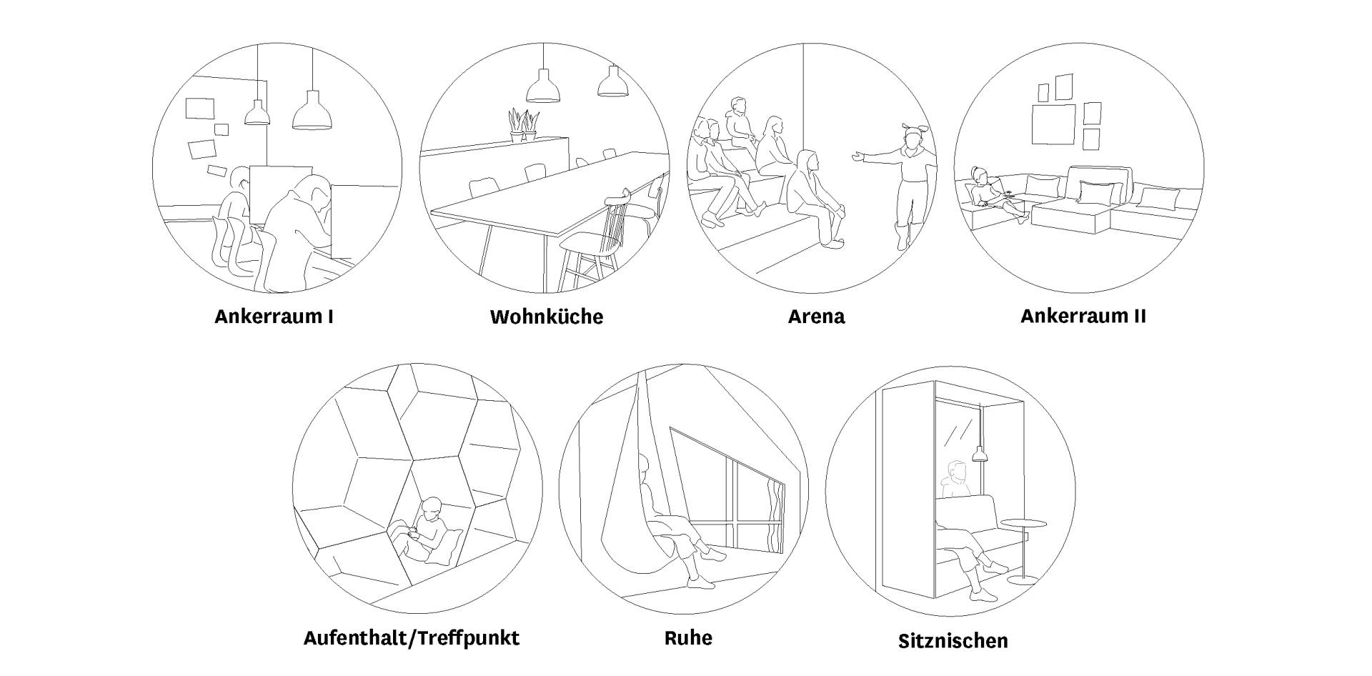 Der Grundriss wird anhand der Aktivitäten neu strukturiert: Ruhige und kommunikative Bereiche, verschiedene Lernsettings sowie Zonen für konzentriertes Arbeiten oder Bewegung werden verortet. Den Räumen werden gezielt Atmosphären wie „hell“, „freundlich“, „anregend“, „einladend“, „wohnlich“, „festlich“, und „funktional“ zugeordnet. Referenzen verdeutlichen die Raumqualitäten im Konzept und fließen ebenso wie die Erfahrungen aus der gemeinsamen Lernreise, in das gemeinsame Leitbild ein.